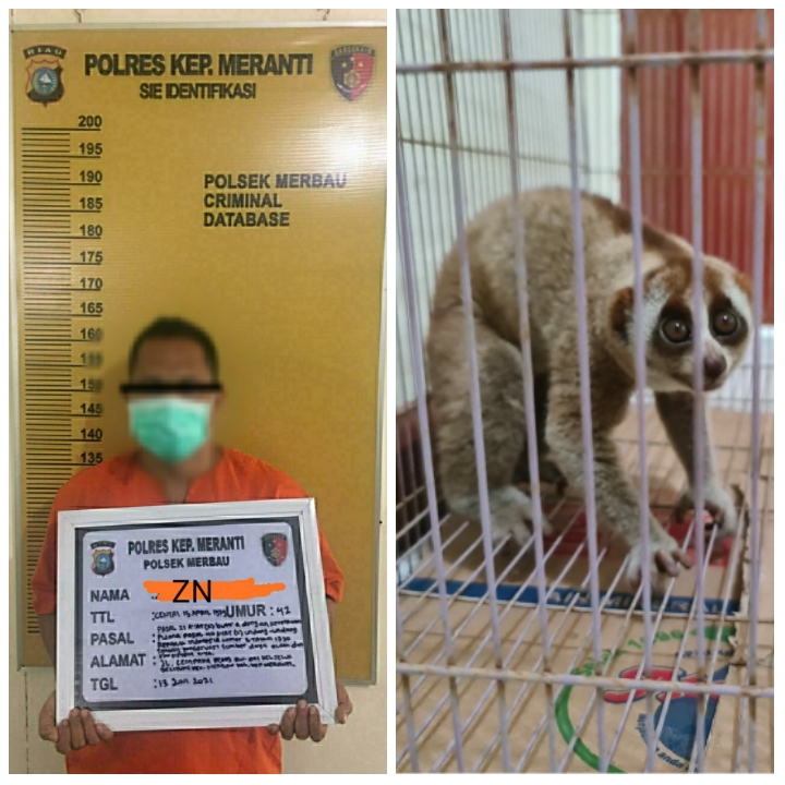 MERANTI (ANEWS) - Polisi menangkap Zn alias U (42) warga Teluk Belitung, Kecamatan Merbau, Kabupaten Kepulauan Meranti, karena menangkap dan memelihara satwa dilindungi jenis kukang, Ahad (13/6/2021).