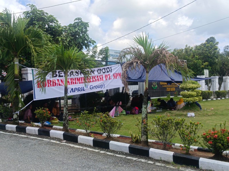 Sejumlah warga Rambahan harus menginap di bawah tenda yang dipasang tepat di depan kantor Kejari Kuansing. Warga juga membentangkan spanduk "Bebaskan Dodi Korban Krominalisasi PT NPM".
