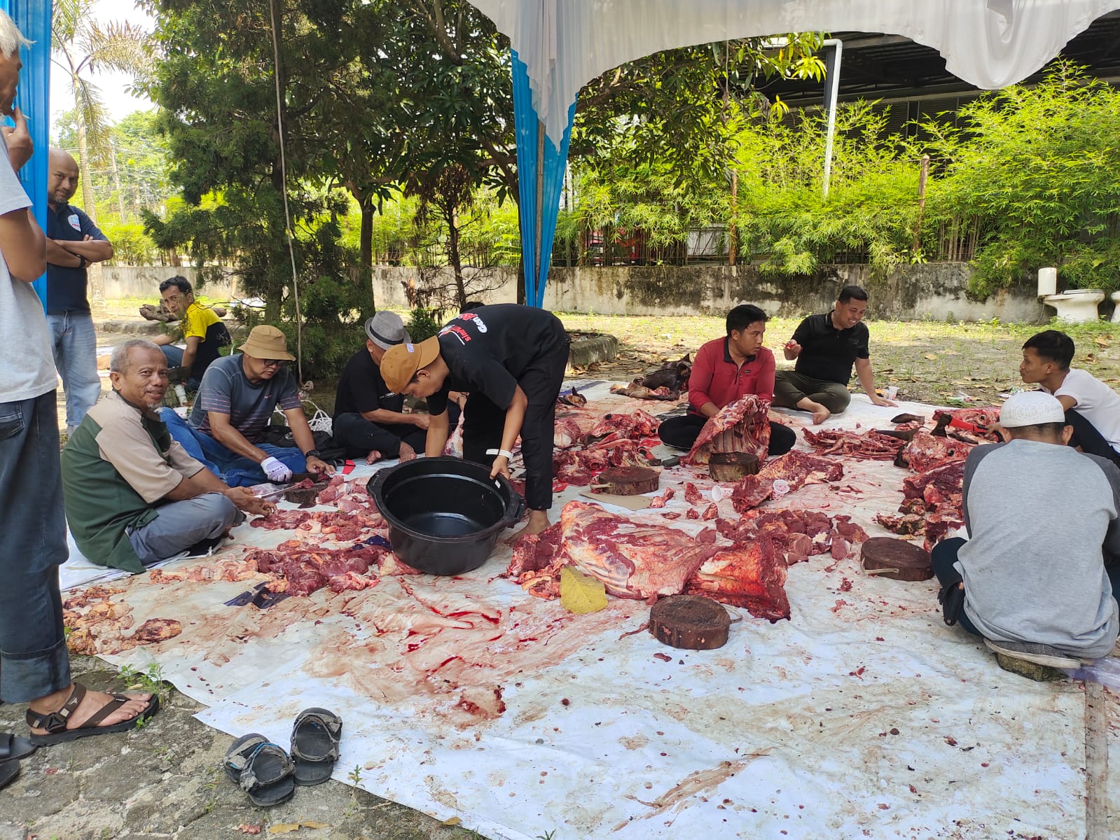 Sebelum daging kurban dibagikan, seluruh panitia dan wartawan yang terlibat dalam penyembelihan turut makan bersama.