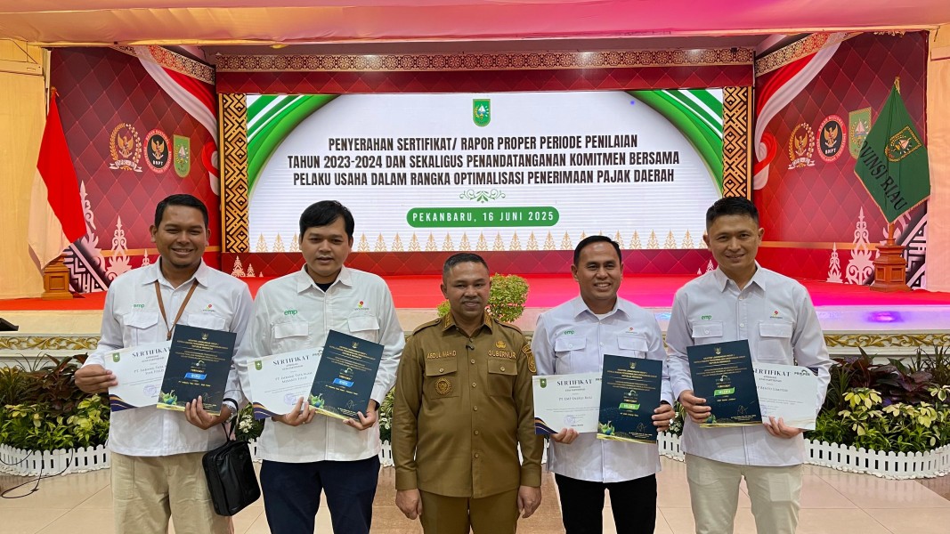 PEKANBARU (ANews) - EMP Group kembali menunjukkan komitmennya dalam pengelolaan lingkungan hidup dengan meraih dua penghargaan PROPER peringkat hijau dan tiga peringkat biru dalam Program Penilaian Peringkat Kinerja Perusahaan (PROPER) periode 2023–2024. Penghargaan ini diserahkan langsung oleh Gubernur Riau, Abdul Wahid, dalam seremoni di Gedung Daerah Balai Serindit, Senin (16/6/2025).