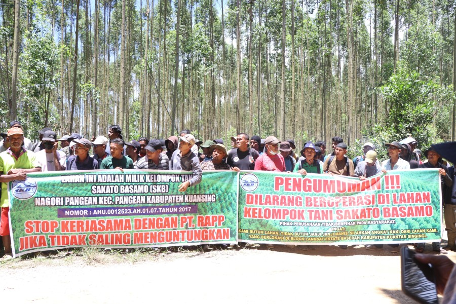 Dengan membawa spanduk seadanya ratusan warga meminta agar PT RAPP melakukan pengosongan terhadap lahan seluas 1.800 ha. Serta menghentikan kerjasama dengan masyarakat yang tergabung dalam kelompok tani.