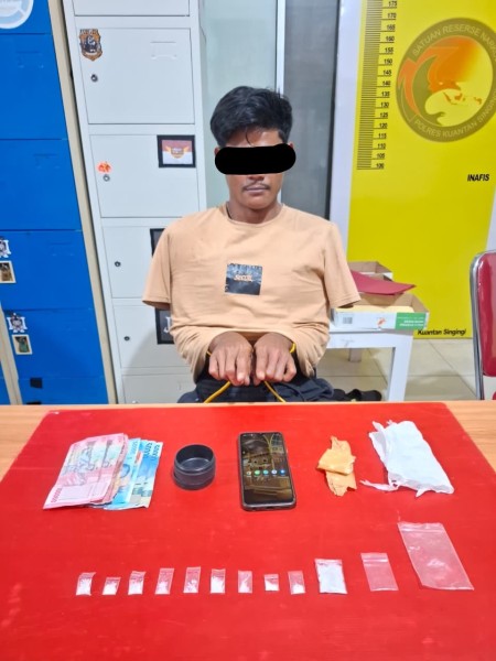 TELUK KUANTAN (ANews) - Tim Mata Elang Satresnarkoba bekuk seorang kurir sabu berinisial E (29) di Desa Titian Modang, Kecamatan Kuantan Mudik, Rabu (19/11/2025).